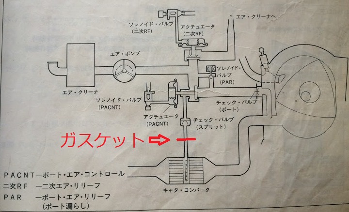 その中でも絞りになってるガスケットの穴径はあらかじめ決められていて、大きくしすぎると触媒で加熱された高温ガスが宇宙船バルブに逆流して早期劣化させてしまう。ちょっとだけ大きくしてたくさん入れて排気ガスがきれいになる、というのもノーマルエンジンに対しては実績としてあまり効果があっても意味が無いようにも感じる。(オーバーラップの大きいサイドポート加工のエンジン等では効果がある)大事なことは、送られた空気の量とエンジンで発生した有害排気ガスの比率は適正であることが重要なのだ。仮にエンジンが純正なのに排気ガス濃度に問題がある場合、コイルや、エアポンプ、ACVの不良を疑った方が得策だと思う。